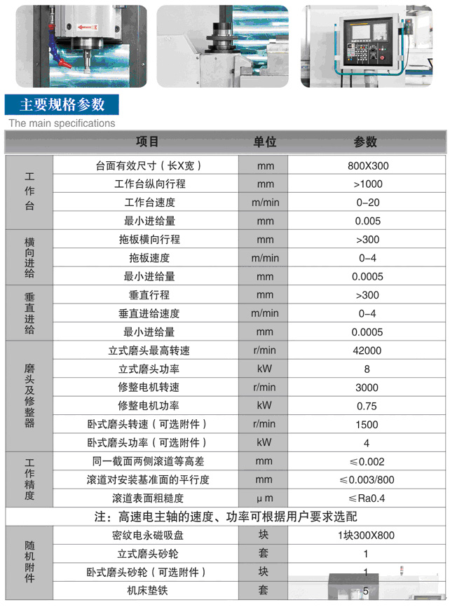 ●数控滑块专用磨床为十字拖板结构,配立式高速电主轴。机床工作台纵向、磨头横向运动、垂直进给均为伺服电机+滚珠丝杆方式驱动,导轨采用直线滚动导轨。